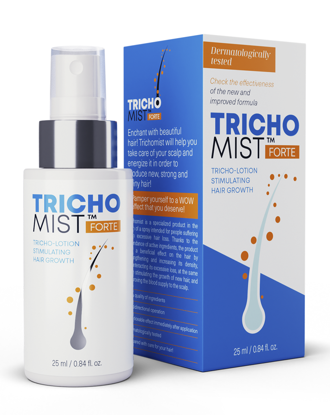 Trichomist Forte je vlasový sprej určený k posílení a výživě vlasů, snížení nadměrného vypadávání vlasů a zlepšení jejich celkového vzhledu. Mezi výhody patří stimulace zdravého růstu vlasů, intenzivní hydratace, snížení lámavosti a lesklejší vzhled.